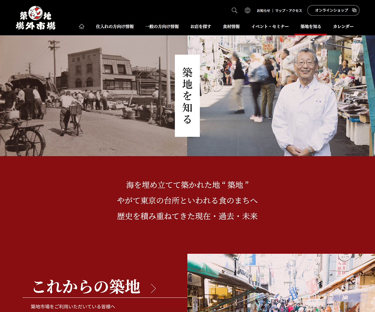 築地場外市場の公式サイトをフルリニューアルしました。”プロの街”としての認知向上、CMSでの更新性の向上を目的とし、仕入れで使われる方(プロの方)と買い物や観光でいらっしゃる一般の方、そして築地場外市場のお店の方、どのユーザーにとっても使いやすくわかりやすいサイトの構成・デザイン設計をしています。